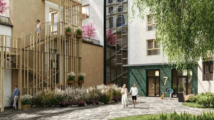 Единый закрытый двор свободный от машин на территории 15 гектаров . Эксклюзивное наполнение : вишневый сад с именными
