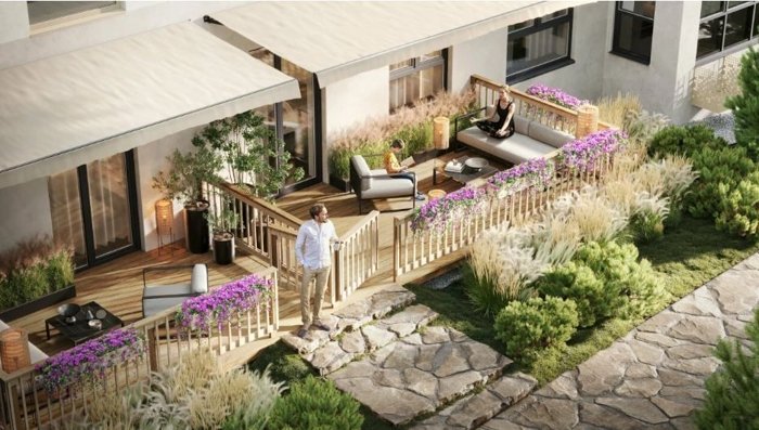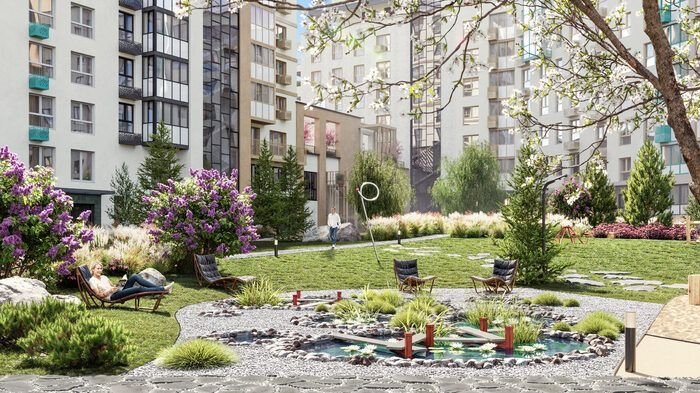 В распоряжении жителей : Чайный дом с камнем созерцания , фитосад , вишневый сад и даже собственные огородики на крыше ,