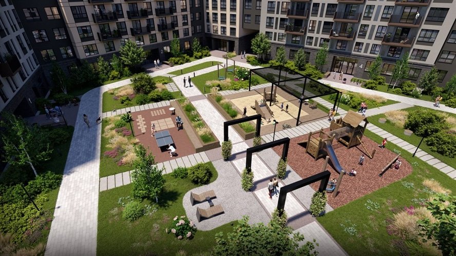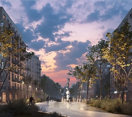 Продуманное пространство для реализации всех необходимых функций с маршрутами для прогулок, пробежек и велопоездок, зонами для йоги и гимнастики, катком, плейхабами, скейт-парком, баскетбольной площадкой и тихими уголками для уединения. А сердцем района станет зеленый бульвар протяженностью больше двух километров.