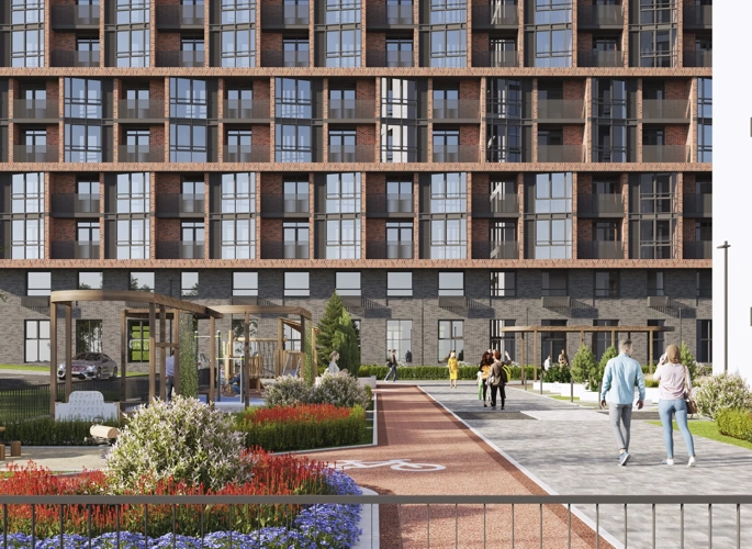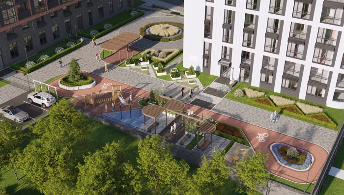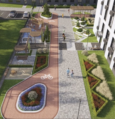 Двор с уникальным ландшафтным дизайном и озеленением, в котором учтены потребности жителей всех возрастов. Детские игровые площадки с мягким безопасным покрытием из натуральных материалов, воркаут и велосипедная дорожка.
