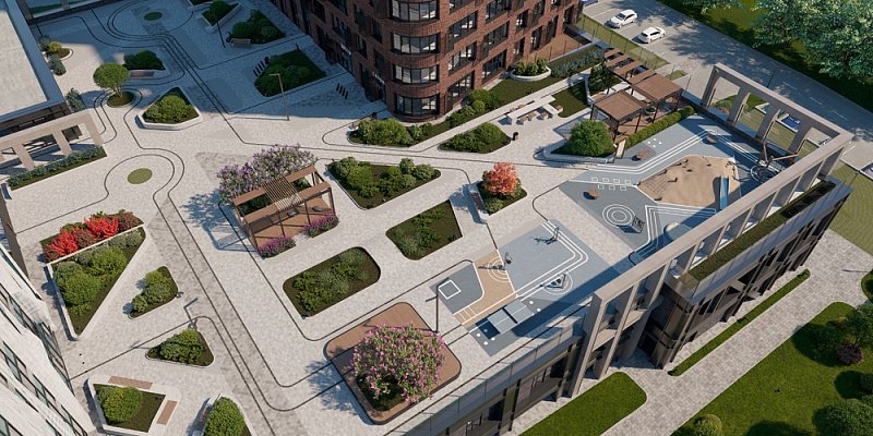Красивый, наполненный зеленью, уютный изолированный двор в жилом комплексе Республика выполняем по индивидуальному проекту ландшафтного дизайна. Он спроектирован в двух вариантах: на кровле стилобата, с противоположной стороны от улицы Карла Маркса, и на просторной эксплуатируемой террасе первого строения жилого комплекса.